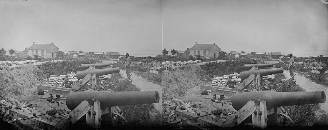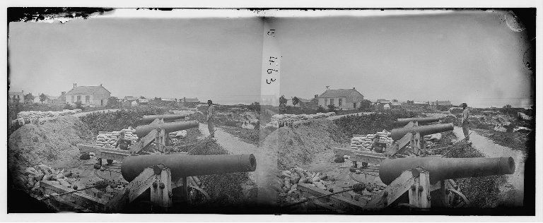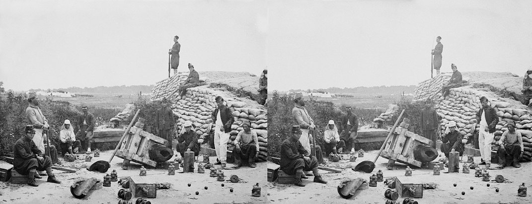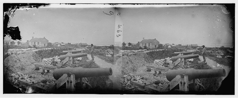 Some of the images in this volume are being shown full-frame for the first time. When the original stereographs were made, sometimes large portions of the image were removed because of the serious flaws in the original negative. During the restoration process, these flaws could be eliminated, which allowed larger areas of the image to be used for the stereograph. For example, the following stereograph originally published by the Gardner Studios shows a naval battery at Yorktown Virginia, with the Nelson Church in the background: